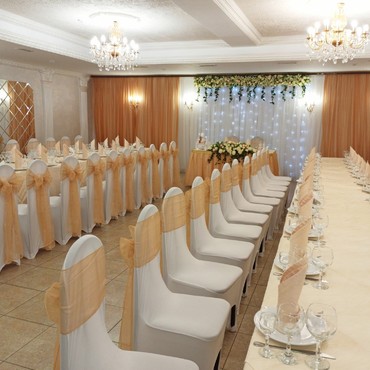 Уютный и просторный банкетный зал имеет гармоничный и изящный интерьер и подойдет для оформления свадьбы в разнообразных цветовых стилях.