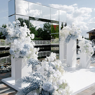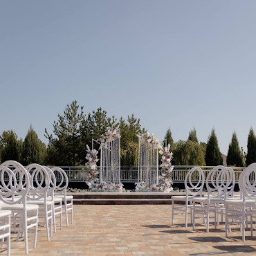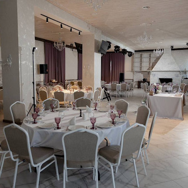 Уютный и просторный банкетный зал имеет гармоничный и изящный интерьер и подойдет для оформления свадьбы в разнообразных цветовых стилях.